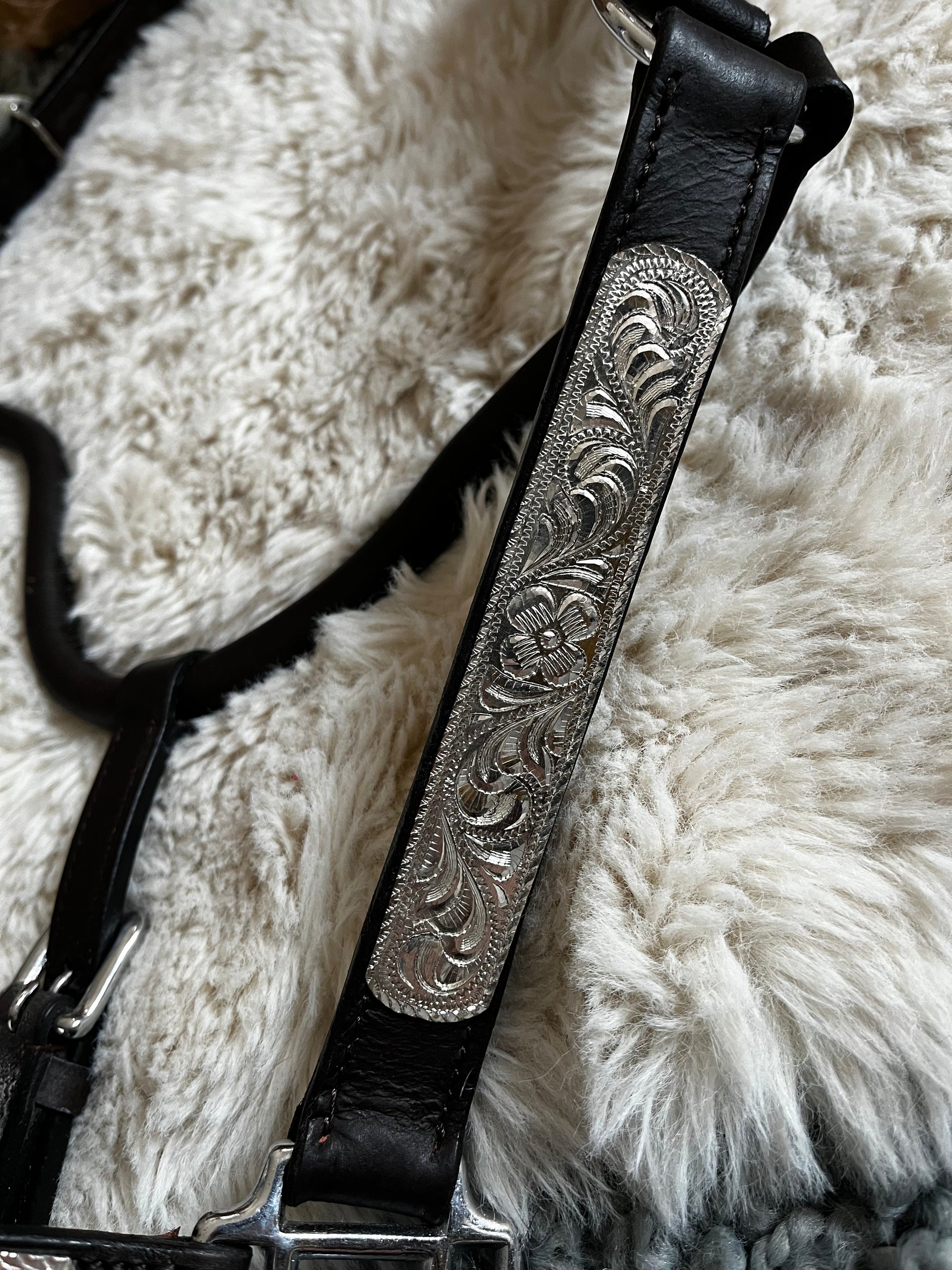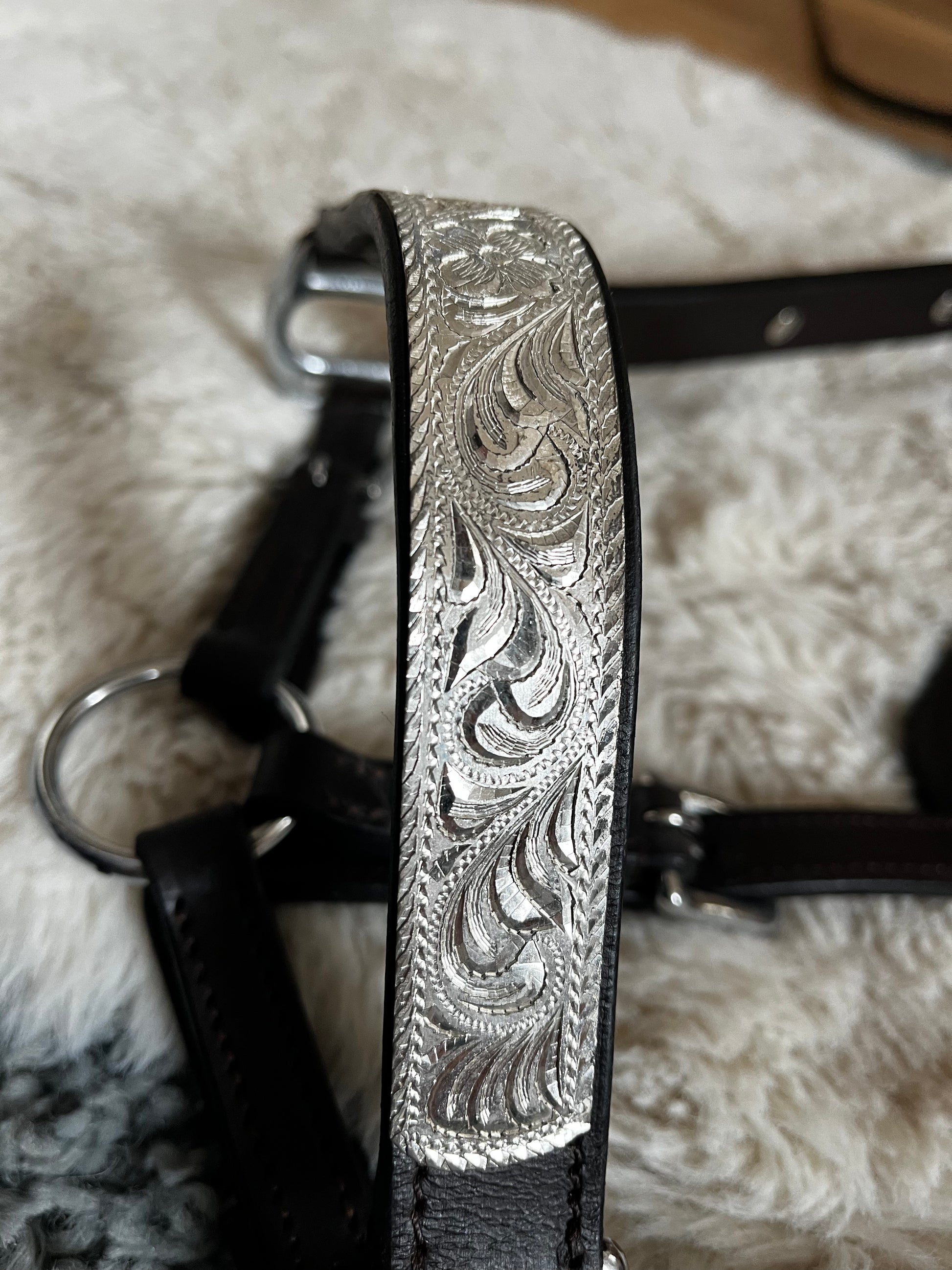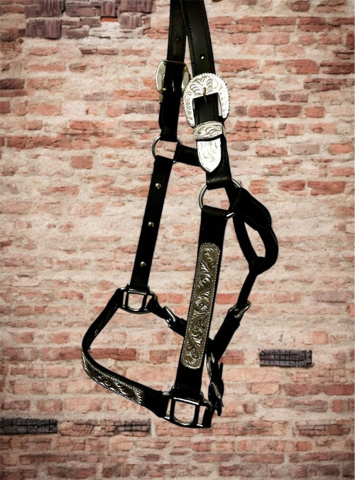 US-Showhalfter aus Leder, verziert mit gravierten Silberplatten.