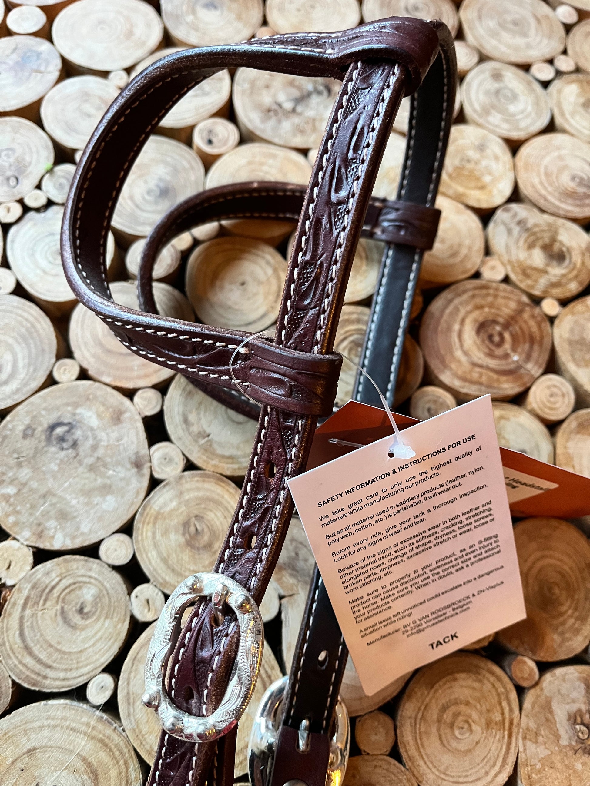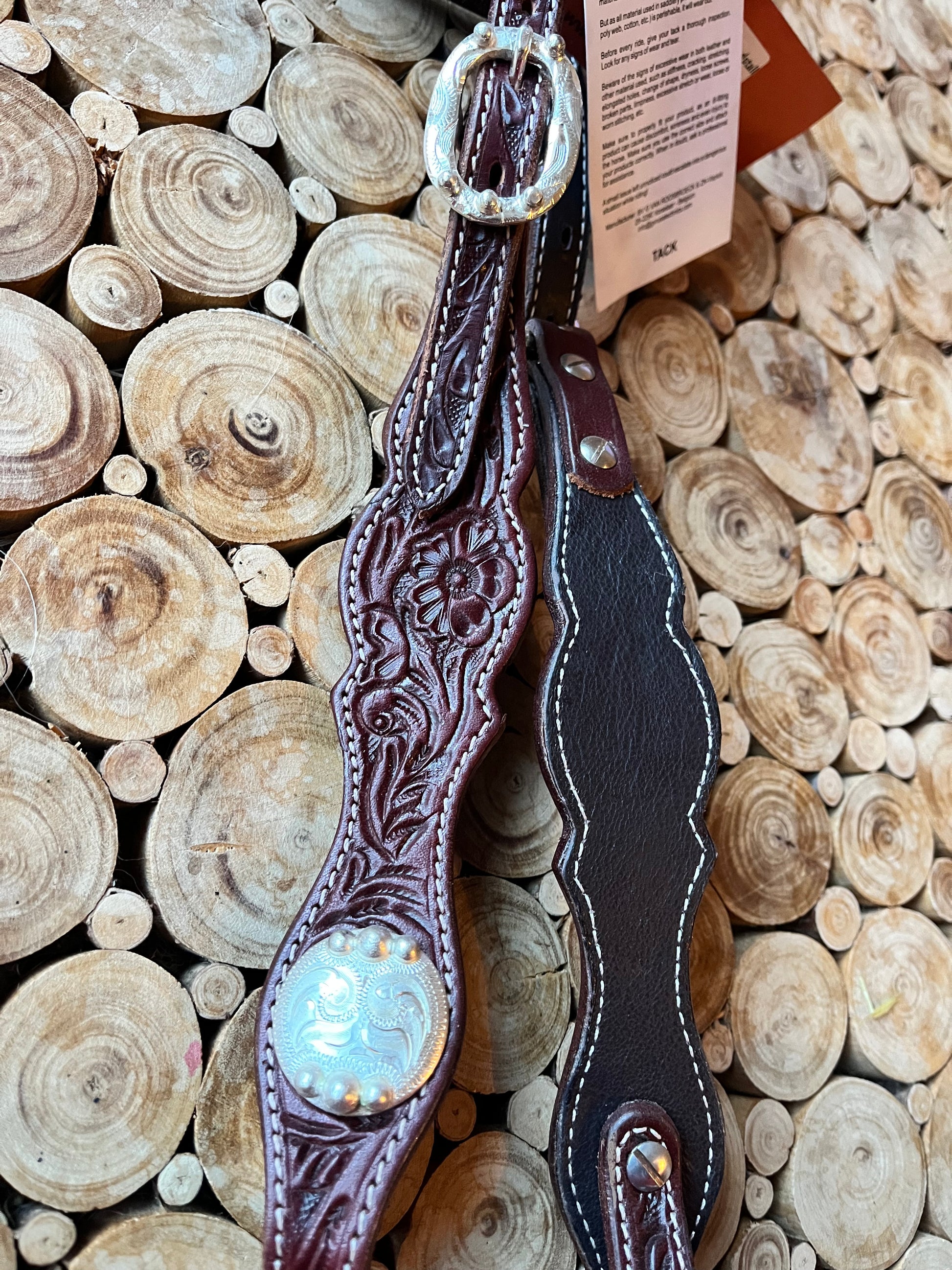 Découvrez cette bride de show western fabriquée en cuir Sedesa haut de gamme, décorée d’un tooling floral élégant. Ses boucles et conchos argentés apportent une touche raffinée idéale pour le show et les entraînements !