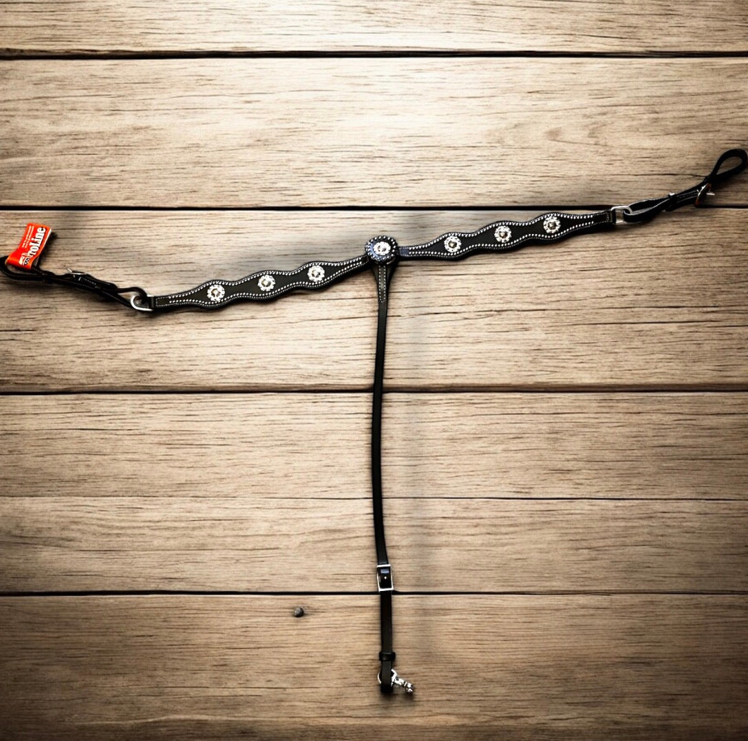 Fabriqué en cuir véritable noir (black), il se distingue par sa solidité, sa souplesse et sa finition soignée. Les conchos décoratifs en métal argenté ajoutent une touche de style western traditionnel, parfaite pour les compétitions, les randonnées ou les entraînements.