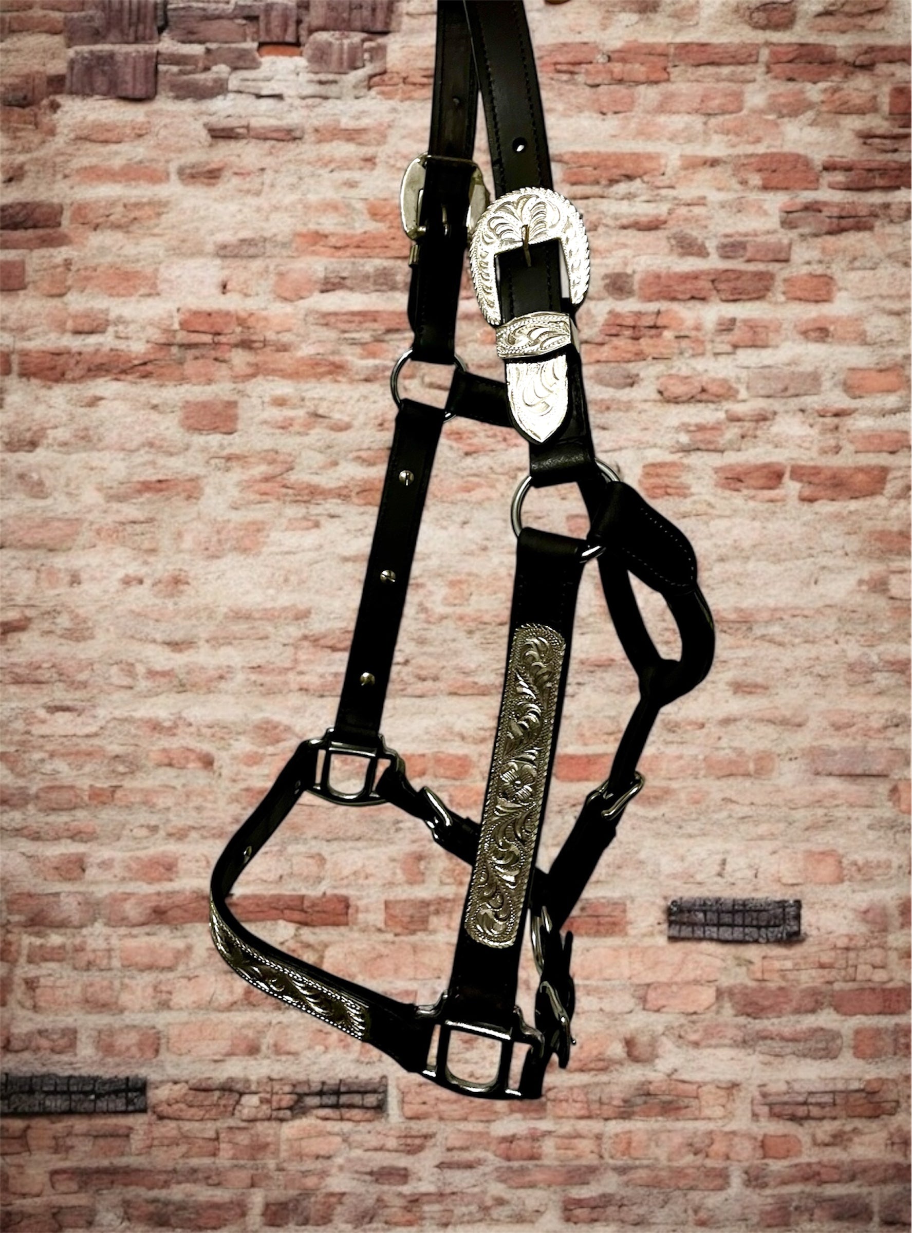 Licol de show en cuir US, décoré de plaques en argent gravées.