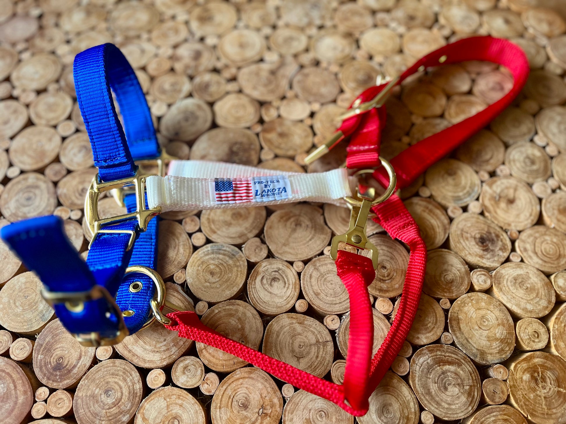 Affichez un style patriotique et affirmé avec ce licol en nylon solide, orné des couleurs du drapeau américain. Résistant et confortable, il est équipé de boucles plaquées laiton pour une finition élégante et durable, même en usage quotidien.